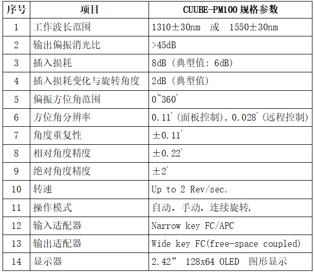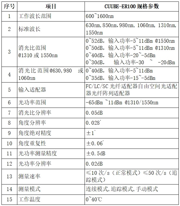 自動(dòng)化偏振消光比測量系統(tǒng)包括一臺(tái)偏振優(yōu)化計(jì)(CUBE-PM100)和一臺(tái)消光比測試計(jì)(CUBE-ER100),兩者配合可自動(dòng)調(diào)整和優(yōu)化線偏振光(PER>45dB)與被測器件保偏尾纖之間的對軸角度,進(jìn)而實(shí)現(xiàn)PER的快速和高精度測量。